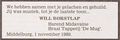 Maar Will's grote passie was en bleef toch de muziek. Hij was wijd en zijd bekend als entertainer en speelde wellicht piano in iedere Zeeuwse zaak die er een staan had. Toen het Nederlands Koffiehuis zijn deuren ging sluiten schreef hij zelfs een enigszins weemoedig doch passend afscheidslied. Natuurlijk was de Mug zijn stamkroeg, de plaats waar hij zich thuis voelde en als een primus inter pares kleur aan het leven gaf. Voor mij is zijn overlijden - en ik weet dat dit sommigen wellicht macaber voorkomt - dan ook van een ongekende schoonheid: hij stierf op 1 november 1989 in het harnas, piano spelend in de Mug.